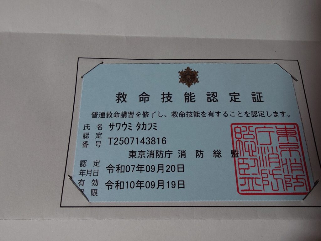 帰宅したら,家にこの前の救命講習の受講証が届いて